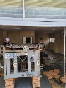 こちらの写真は先日、約2tの機械を70cmの窓を超え搬出している様子です。