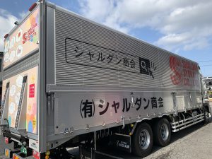 大型トラックが本日、初出動です。 安全運転を祈願いたしまして、 お清めの酒を振りかけています。 お客様の期待に応える物流総合コンサル業を目指して!