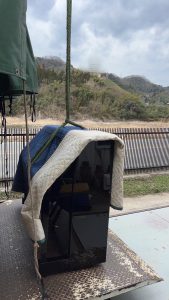 ピアノに傷が付かないように毛布を上から重ねてクレーンで吊ります。