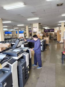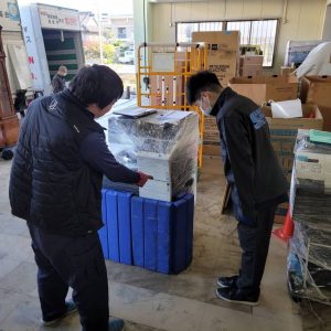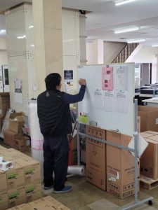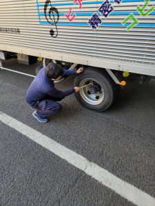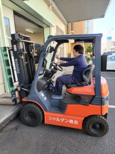 朝一番に、パレットの掃除・交通安全をご祈念・フォークリフトの動作チェック・トラックの運行前点検・社員への申し送り
